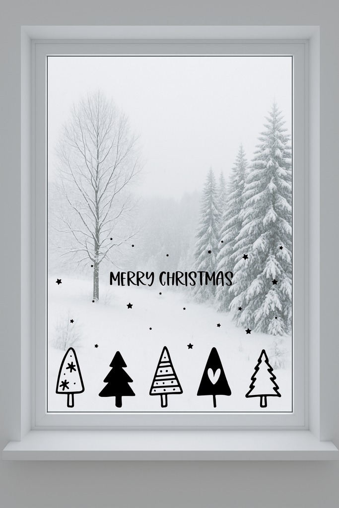 Bring Winterzauber ans Fenster: Unser Vinyl-Set „MERRY CHRISTMAS“ kombiniert 5 minimalistische Tannenmotive, den Schriftzug MERRY & CHRISTMAS sowie Sterne in verschiedenen Größen. Das hochwertige Vinyl haftet sicher auf glattem Glas und lässt sich ohne Rückstände wieder entfernen – ideal für Zuhause, Büro oder Schaufenster.